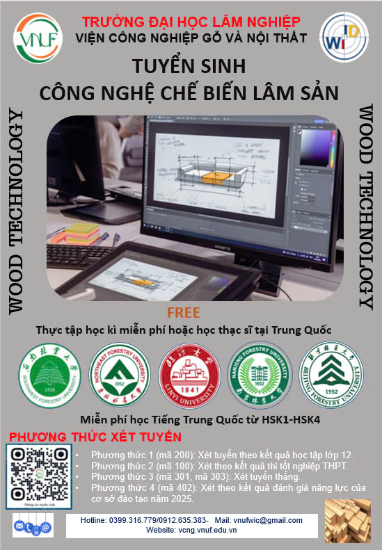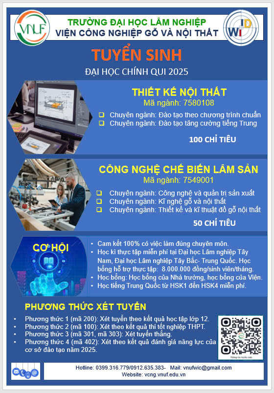 Đọc tiếpTuyển sinh đại học chính qui 2025 ngành Chế biến Lâm sản và ngành Thiết kế nội thất của Viện Công nghiệp gỗ và Nội thất