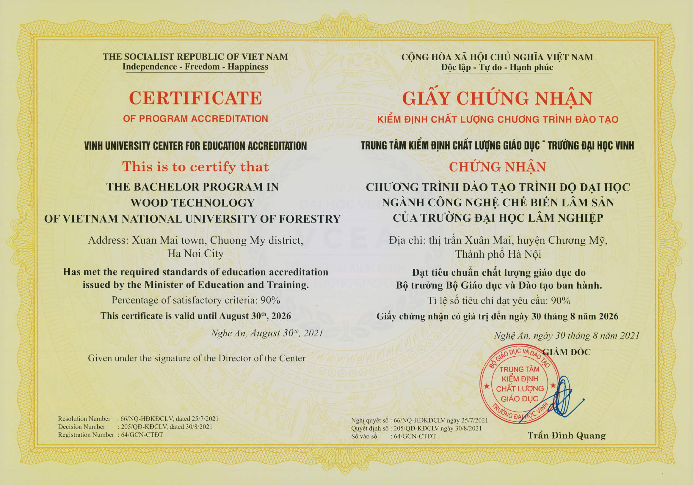 Tiếng Việt: Công nghệ chế biến lâm sản Chuyên ngành: Công nghệ gỗ và Quản lý sản xuất; Kỹ nghệ gỗ và Nội thất, Thiết kế và Kỹ thuật đồ gỗ nội thất